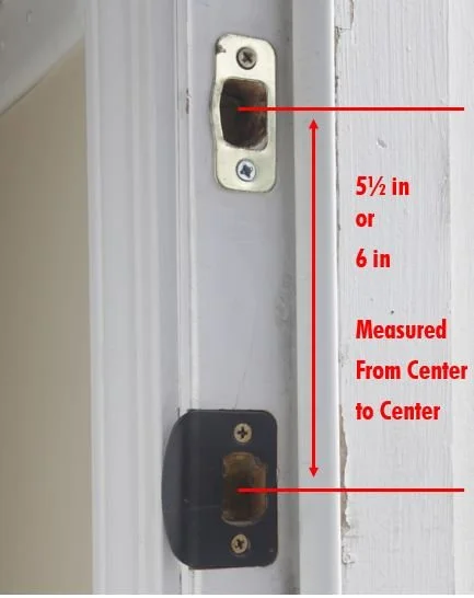 WITH DOOR OPEN, USING A TAPE MEASURE, MEASURE CENTER OF LATCH HOLE TO CENTER OF DEADBOLT CUTOUT. (SEE IMAGE ON RIGHT).