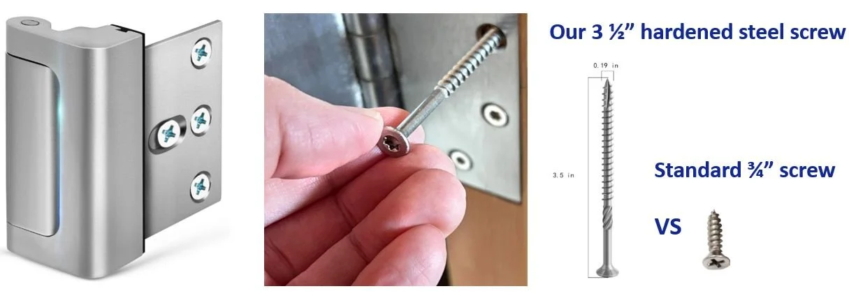 Replacement of all OEM deadbolt strike/latch strike/hinge screws w/3-½” hardened steel anchoring screws.